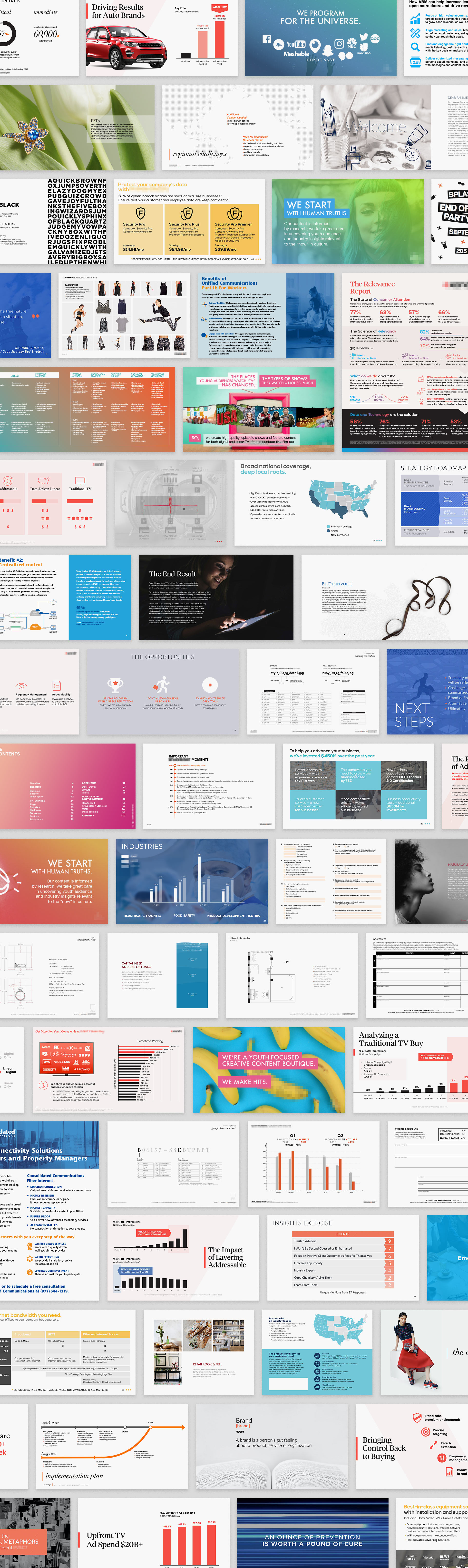 Dozens of decks, docs, forms, and sheets for various clients.